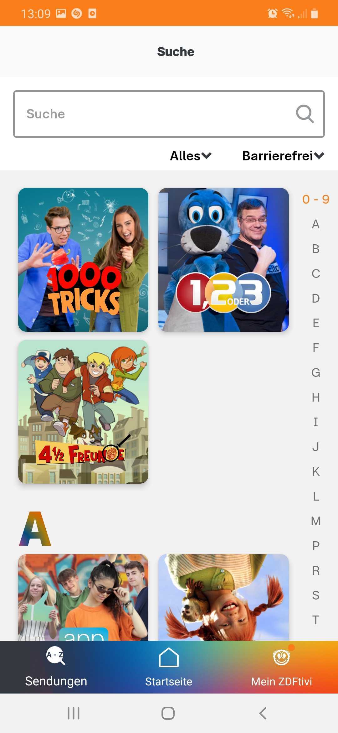 Beim Öffnen der App gelangen Sie auf die Startseite. Über den Butto unten rechts gelangen Sie in den ZDFtivi-Kinderbereich. Dort können Sie Sendungen und Folgen finden, welche Sie für Ihr Kind angepinnt haben.
