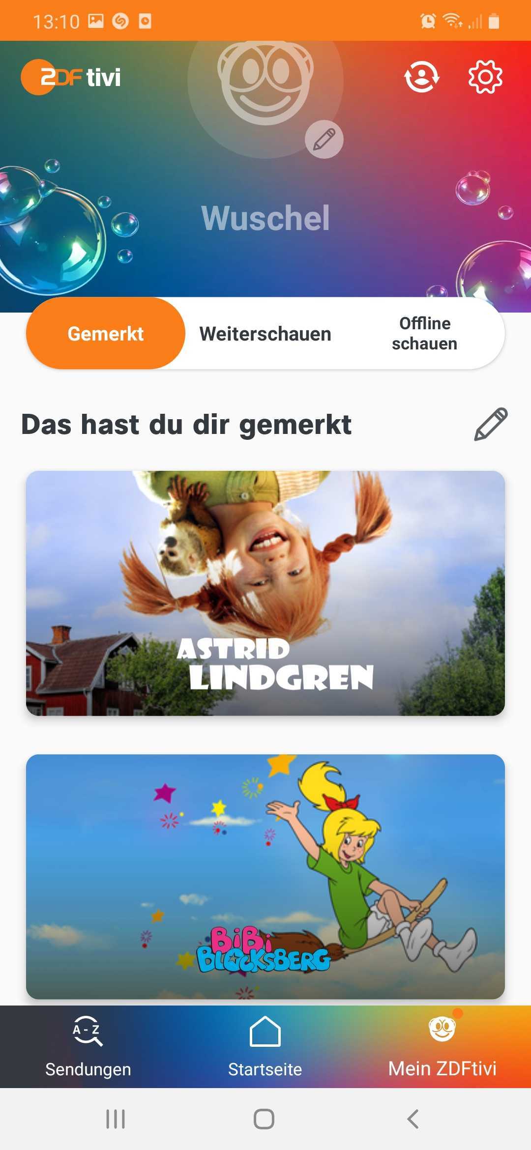 Hier sehen Sie den ZDFtivi Bereich. Gemerkte Sendungen und Folgen werden hier angezeigt. Wählen Sie den Reiter Weiterschauen, um Folgen zu sehen, welche Ihr Kind angefangen, aber noch nicht bis zum Ende gesehen hat. Unter Offline schauen finden sich heruntergeladene Folgen.