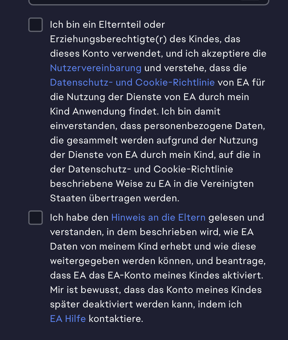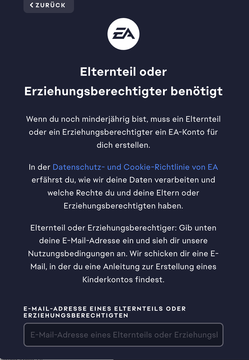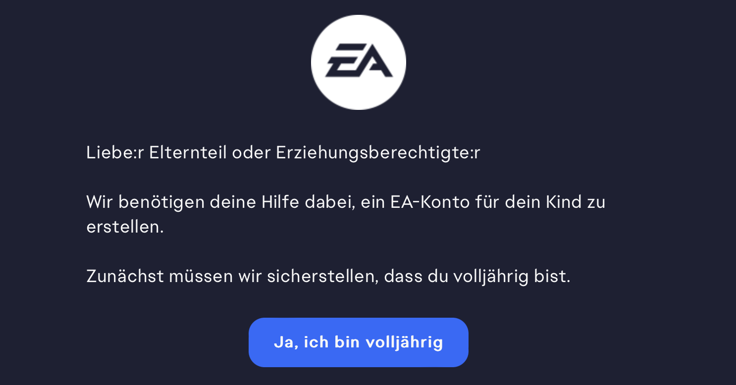 Ab dem 16. Lebensjahr erhält Ihr Kind ein Teenager-Konto. Mit einem Teenager-Konto kann Ihr Kind auf alle Spiele und Funktionen wie Online-Spiele, Chats mit Freunden oder Käufe im Online-Store zugreifen. Das Teenager-Konto kann mit dem Eltern-Konto verbunden werden, um Ausgaben und Spielzeiten zu regulieren. Eine Anleitung dafür finden Sie auf der Webseite von Electronic Arts.