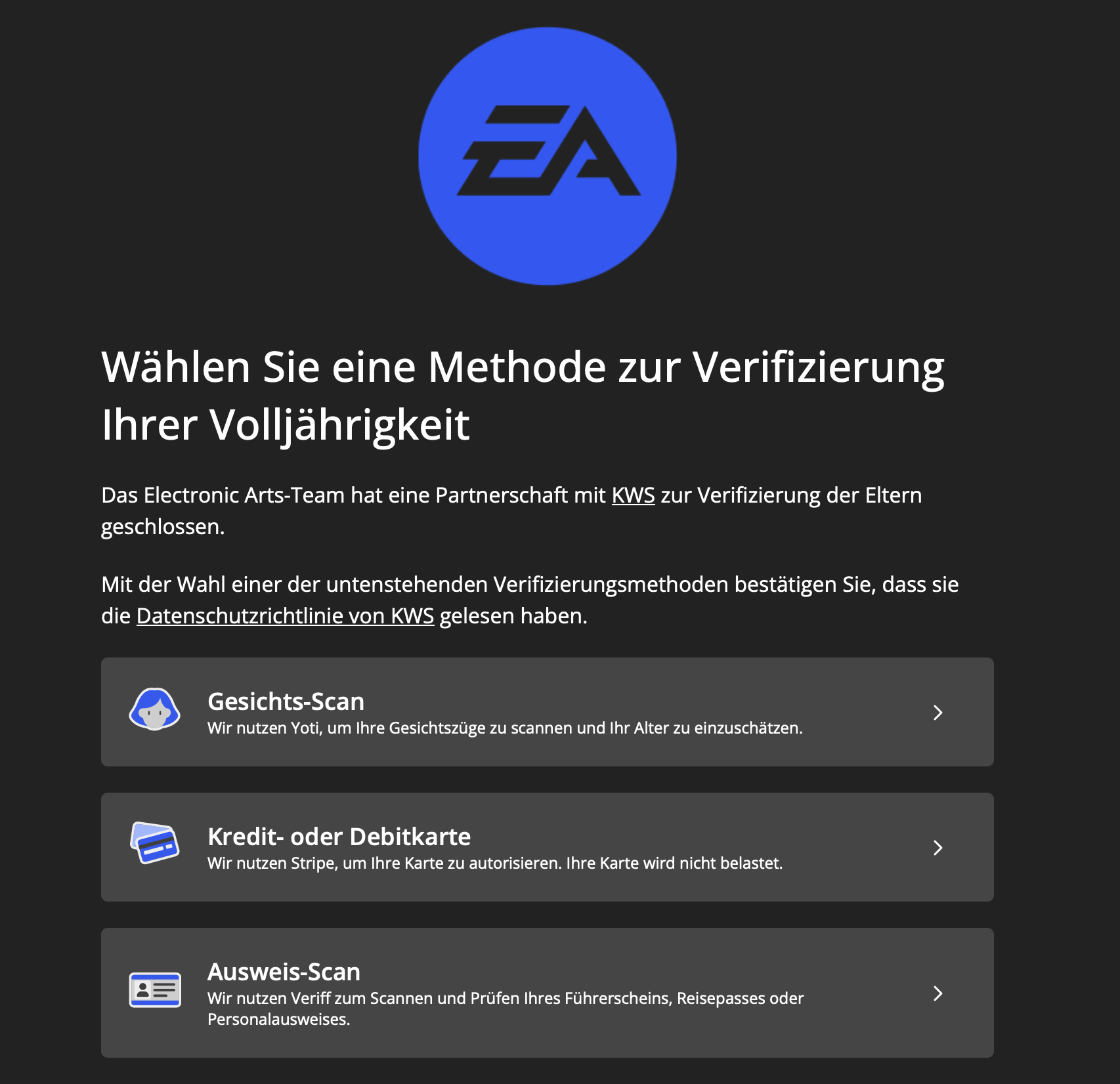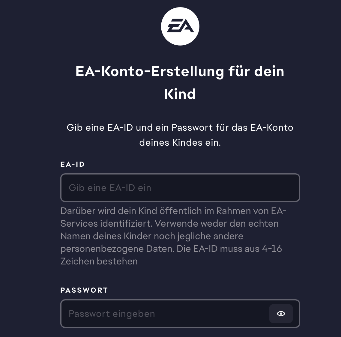 Für Kinder unter 16 Jahren richtet EA automatisch ein Kinder-Konto ein. Kinder Konten erhalten am PC oder am Mac keinen Zugriff auf Online-Funktionen. Außerdem können sie keine Käufe durchführen, da sie nicht auf den EA-App-Store zugreifen können. Somit können sie auch keine EA Play-Mitgliedschaft besitzen oder keine EA-Geschenkkarten einlösen. Sie können ihre Spiele nicht mit den sozialen Medien verbinden oder ihre Konten nicht mit Diensten wie Steam verknüpfen. Wenn Ihr Kind ein Spiel in die Bibliothek hinzufügen will, kann es einen Spielcode einlösen. Das Spiel wird dann automatisch in die Sammlung ergänzt.