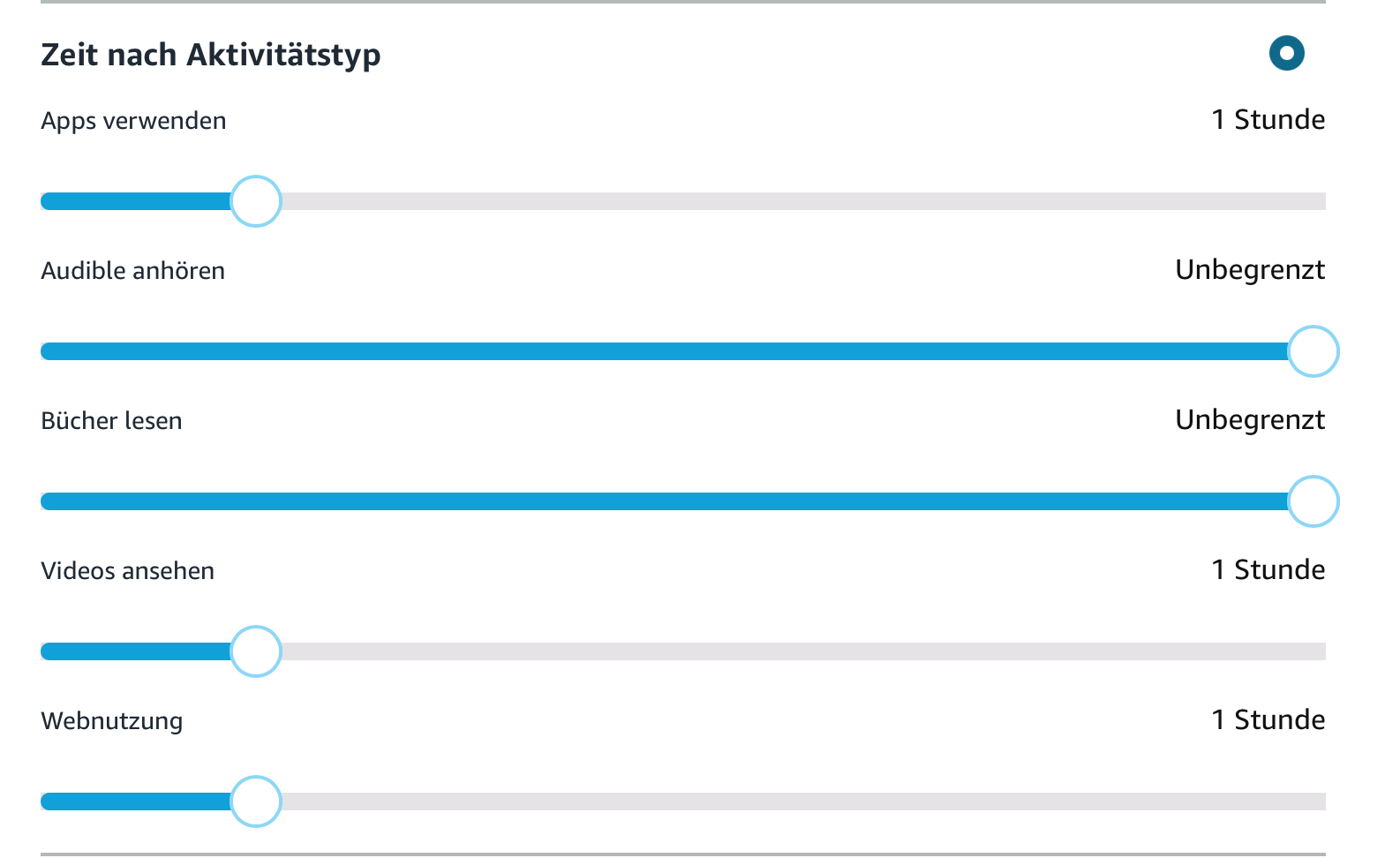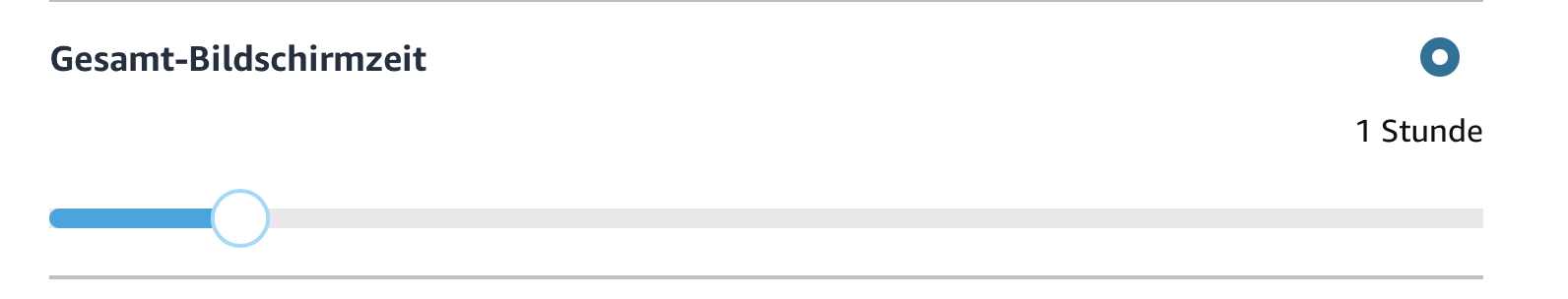 Wie lange soll Ihr Kind alle Geräte am Tag benutzen? Eine Stunde? Zwei Stunden? Entscheiden Sie. Stellen Sie die Zeit ein. Die Zeit gilt für alle Geräte zusammen. Zum Beispiel: Ihr Kind ist eine Stunde am Tablet? Dann gehen alle Geräte mit Amazon Kids nach einer Stunde aus. Das geht so:
