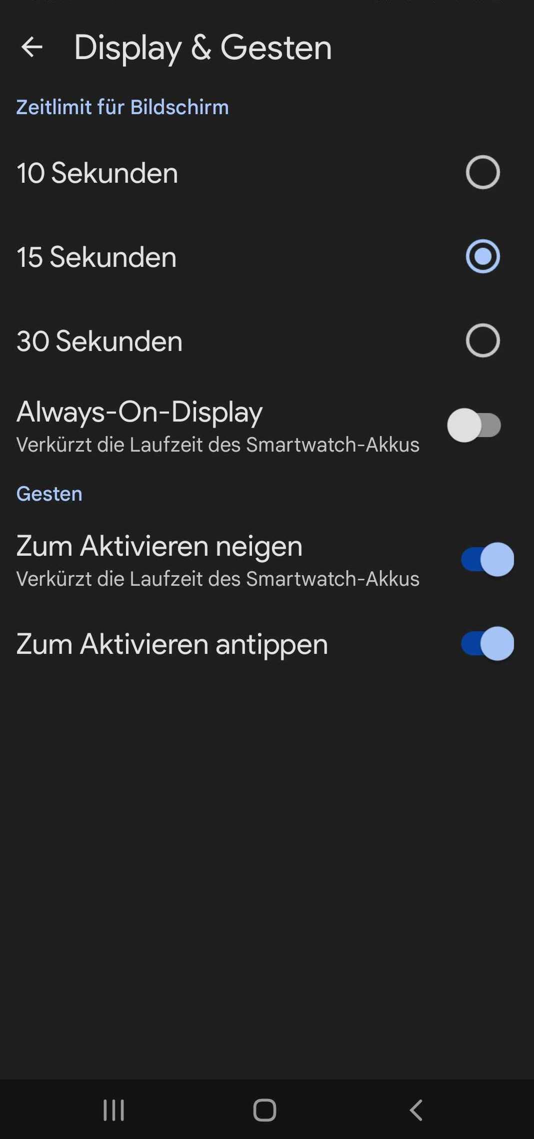 Wählen Sie: Display & Gesten Wann soll das Display der Smartwatch ausgehen? Stellen Sie es hier ein. Oder wählen Sie: Always-On-Display Dann ist das Display immer an. Sie können auch Gesten anmachen. Dann kann Ihr Kind Bewegungen mit dem Arm machen. Und die Smartwatch macht dann etwas. Zum Beispiel geht dann das Display an.