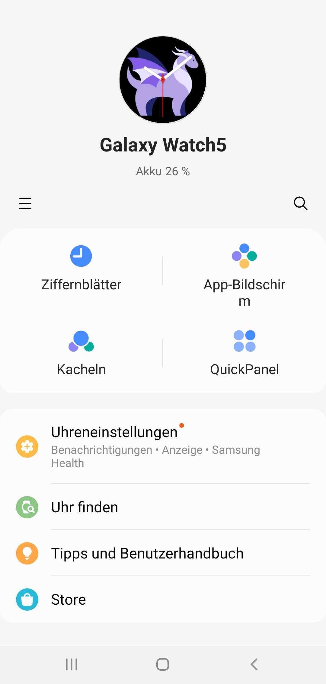Öffnen Sie die Galaxy Wearable App. Über die vier oberen Punkte Ziffernblätter, App-Bildschirm, Kacheln und Quick Panel können Sie die Darstellung der jeweiligen Funktionen ändern. Beispielsweise kann das Design der Uhr oder die Anordnung der Apps geändert werden. Überlegen Sie mit Ihrem Kind gemeinsam, welche Funktionen sinnvoll sein könnten und ordnen Sie diese so an, dass Ihr Kind die wichtigen Funktionen leicht finden kann. Klicken Sie anschließend auf den Menüpunkt Uhreinstellungen.