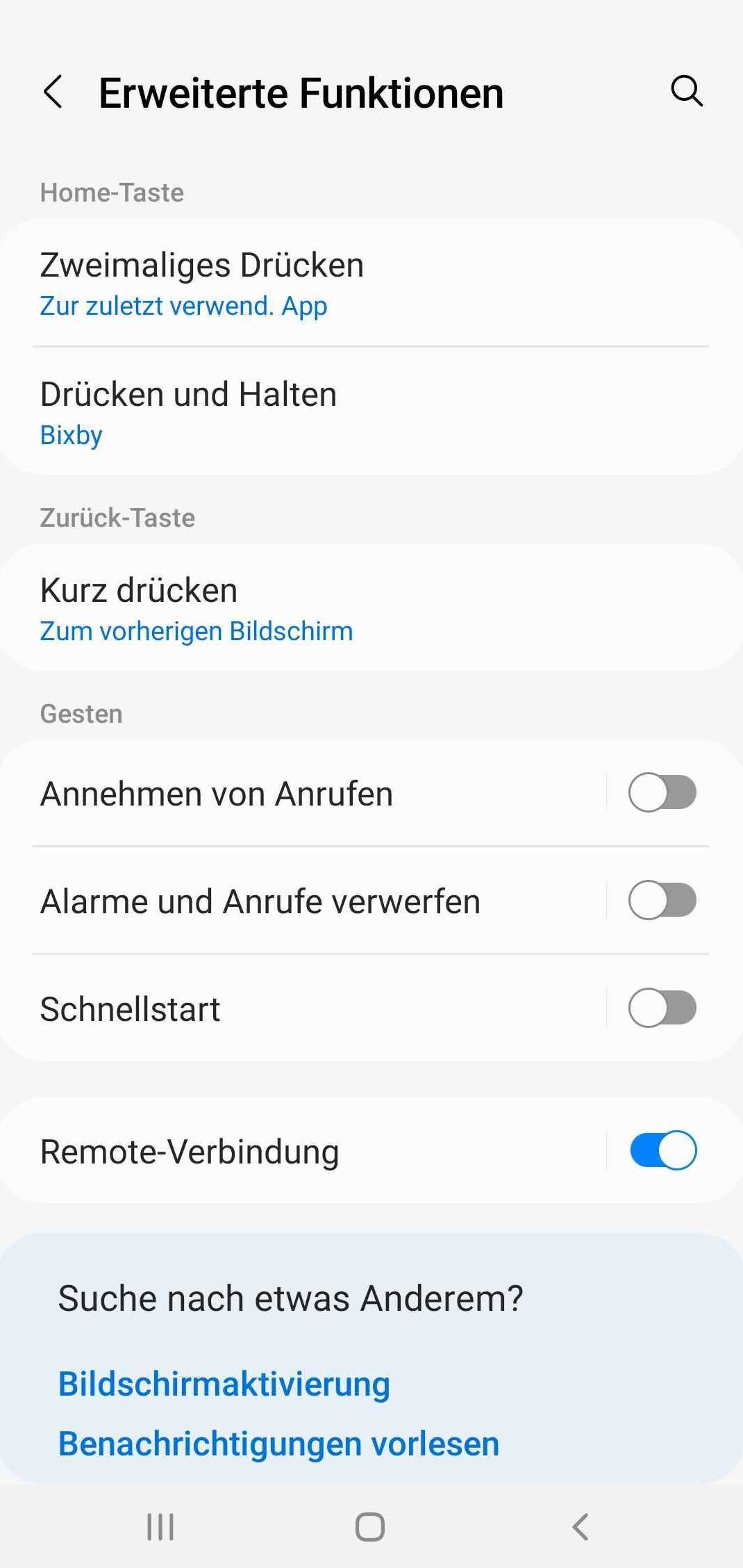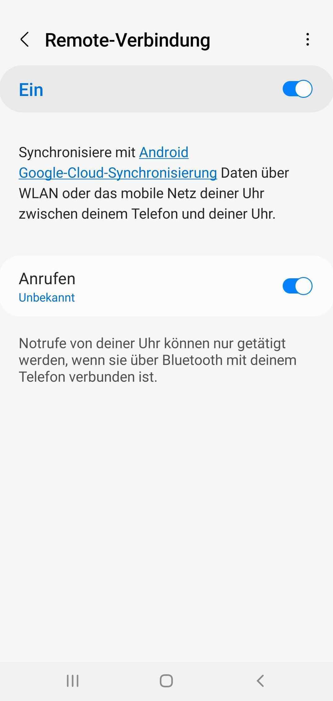 Ist die Smartwatch Ihres Kindes mit einer SIM-Karte ausgestattet, ist auch dieser Menüpunkt interessant: Wählen Sie Erweiterte Funktionen → Remote-Verbindung. Wenn Sie hier den Schieberegler aktivieren, werden die Daten zwischen dem Smartphone Ihres Kindes und der Galaxy Watch über die Android Google-Cloud ausgetauscht. Wenn Sie zusätzlich den Schieberegler bei Anrufe aktivieren, ist es Ihrem Kind möglich auch dann Anrufe über die Smartwatch auszuführen, wenn gerade keine Bluetooth-Verbindung zwischen dem Smartphone und der Uhr besteht. In diesem Fall steht in dem blauen Text unter dem Menüpunkt Anrufe nicht mehr Unbekannt, sondern die Telefonnummer der SIM-Karte. Sie werden dann zur Einstellung Anrufe/SMS auf anderen Geräten weitergeleitet. Aktivieren Sie dort den Schieberegler Mobile Daten verwenden. Dann kann Ihr Kind über die mobilen Daten telefonieren und ist nicht auf ein WLAN-Netz angewiesen.