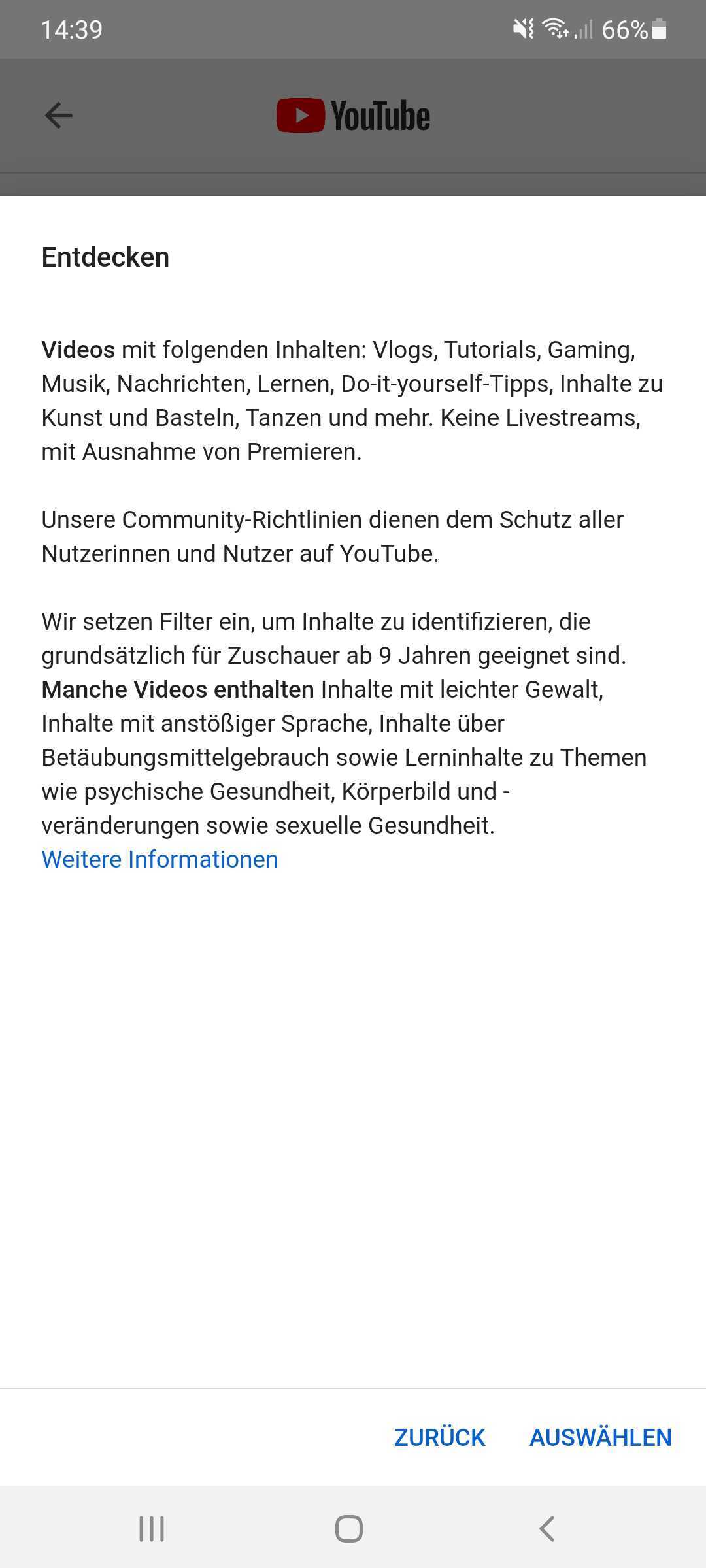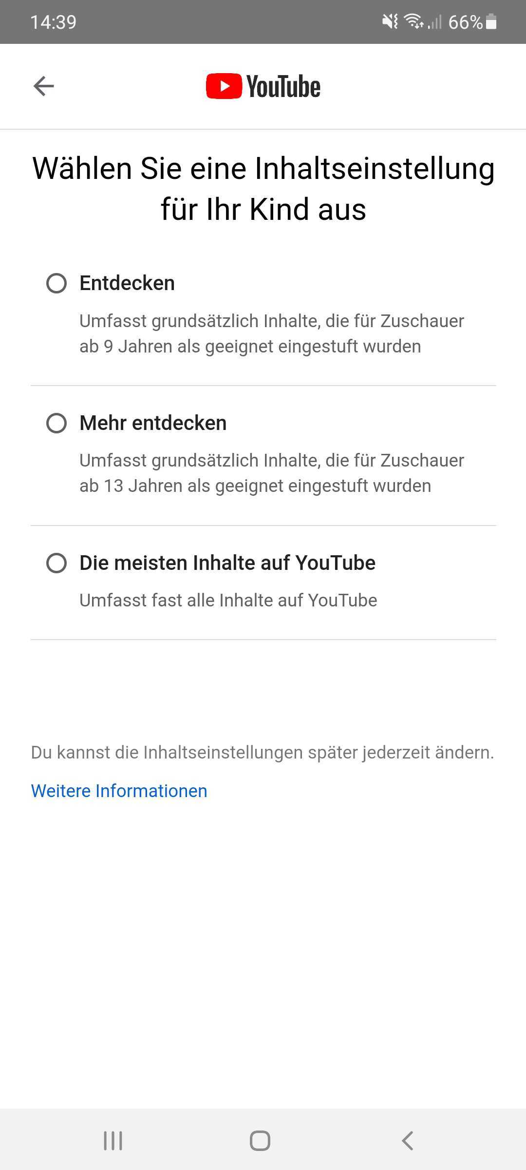 Bei der Aktivierung der Elternaufsicht können Sie sich zwischen drei Kategorien entscheiden: Entdecken, Mehr entdecken und Die meisten Inhalte auf YouTube. Je nach Auswahl werden Videos gefiltert und angezeigt.