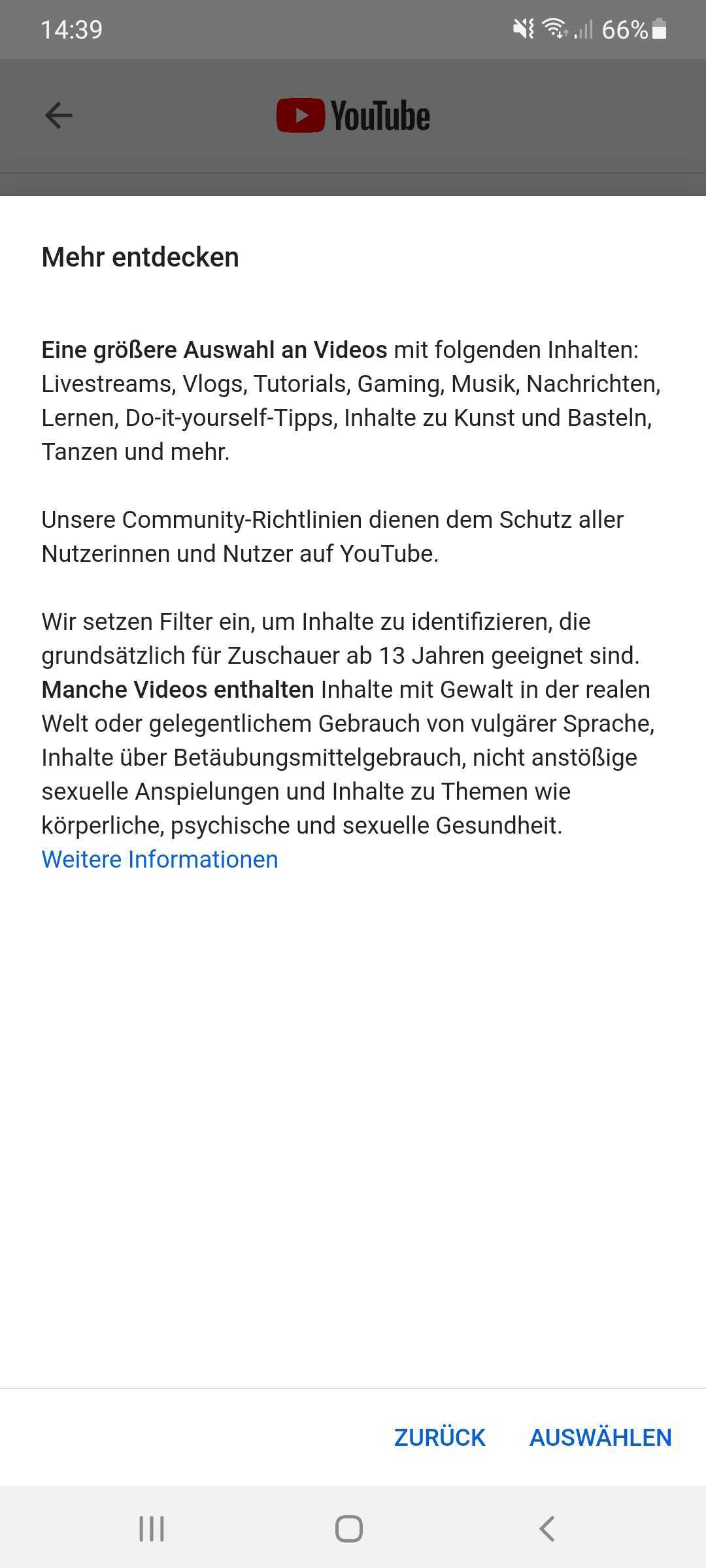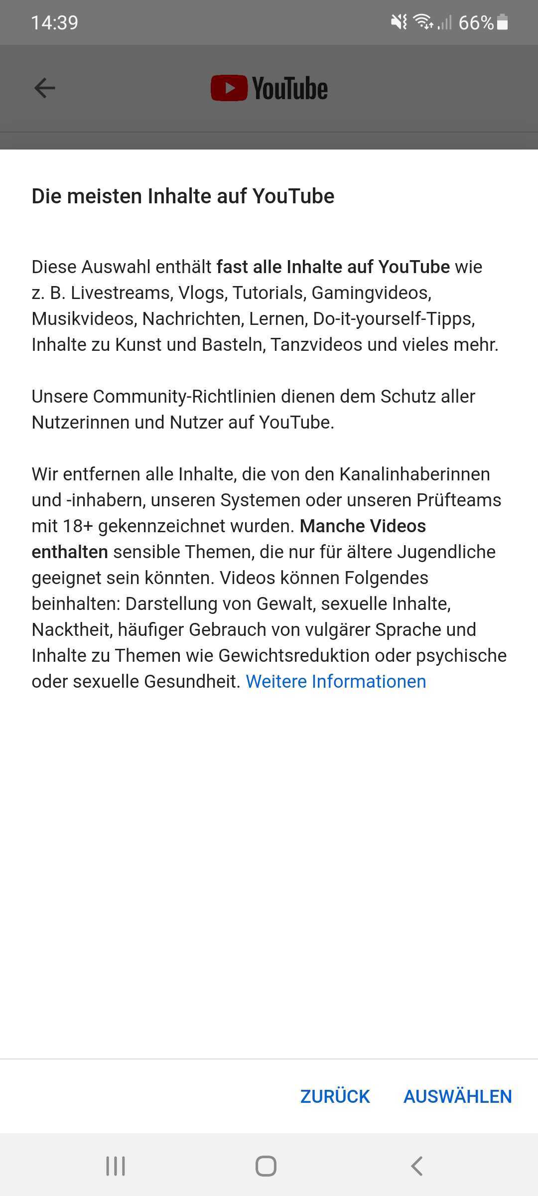 Mit dieser Einstellung stehen mehr Inhalte zur Auswahl. Es werden Videos zu augewählten Themen angezeigt, wobei auch Livestreams übertragen werden. Die Inhalte können unter anderem Gewalt und vulgäre Sprache beinhalten.